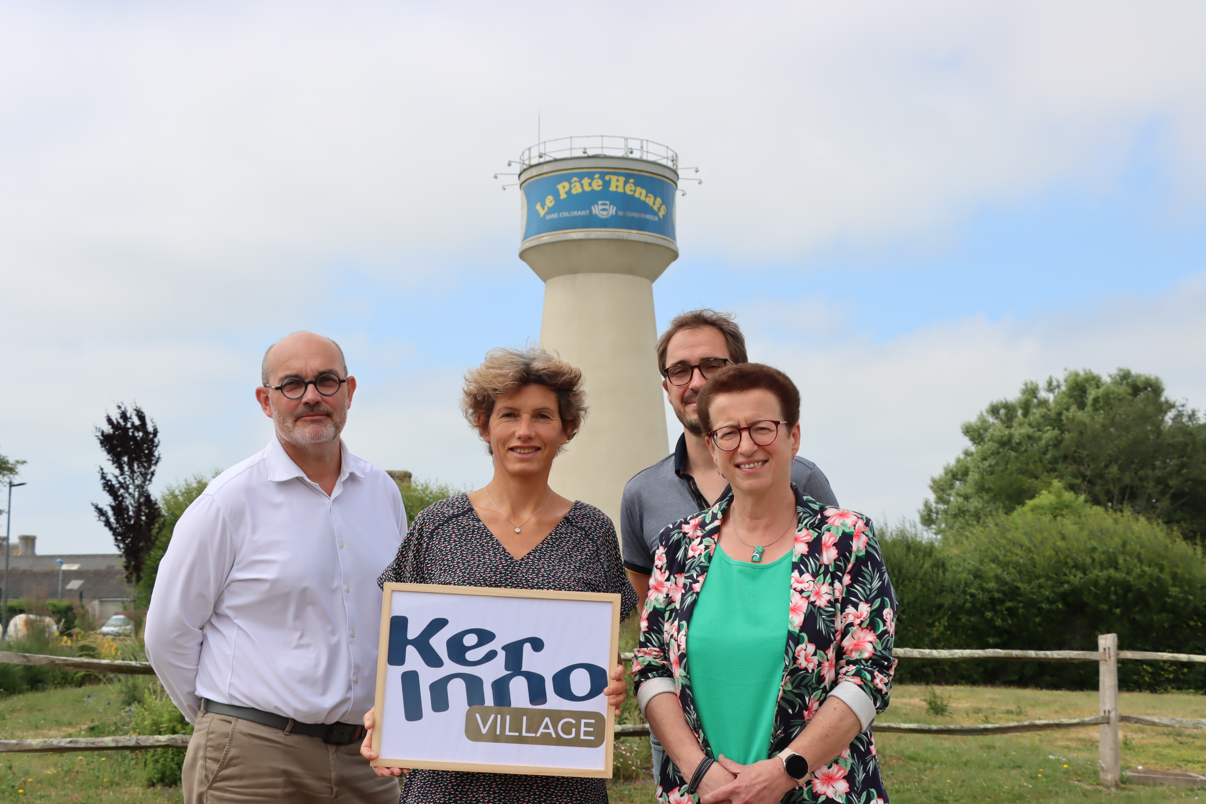 Loïc Hénaff, PDG, Caroline Guivarc’h, Directrice de la R&D et innovations Groupe Hénaff ; Josiane Kerloc’h, Présidente de la Communauté de communes du Haut Pays Bigouden, Fabien Le Bleis, chef de projet Agroalimentaire Technopole Quimper-Cornouaille – Crédits CCHPB